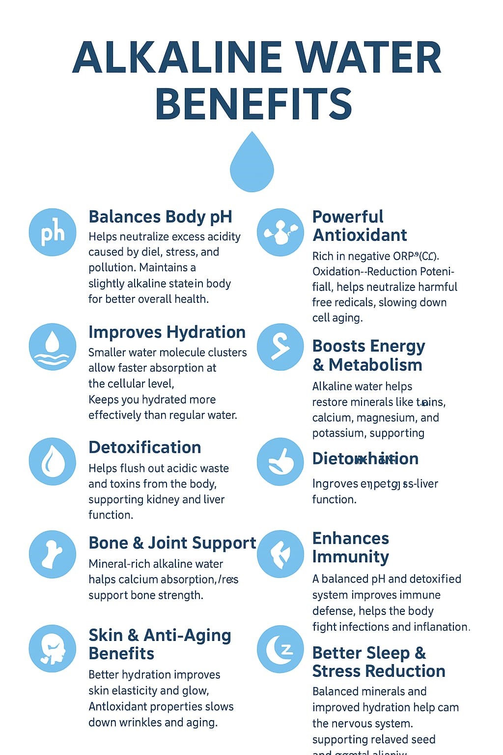 - Alkaline water maintains body pH balance, reducing fatigue and supporting a calm, balanced mind.